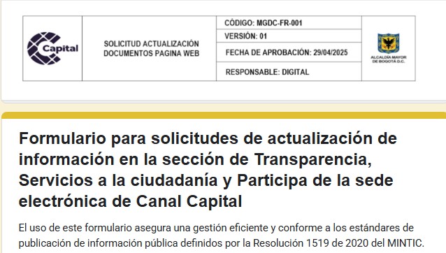 – Ubica el Formulario para solicitudes de actualización de información en la sección de Transparencia, Servicios a la Ciudadanía y Participación de la sede electrónica de Canal Capital para lo cual debes hacer clic aquí