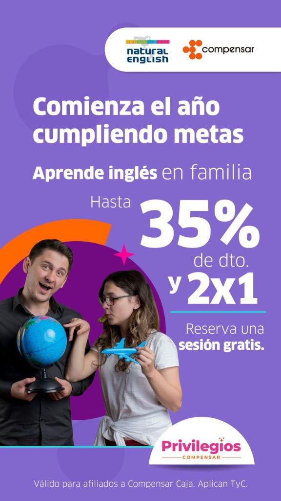 Si eres afiliado a Compensar Caja tienes hasta 35% de descuento en tu curso de inglés. Puedes preguntar por la promoción 2×1 en tu matrícula para que aprendas inglés en familia.
