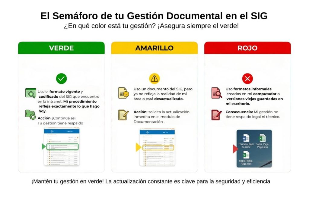 Este es un punto vital. El Sistema Integrado de Gestión (SIG) no es un archivo estático, sino un reflejo vivo de nuestra operación. Cuando los documentos se dejan “envejecer” o no representan lo que realmente hacemos en el día a día, el riesgo es igual de alto que usar documentos informales.