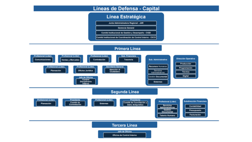 - Tercera línea de defensa: Proporciona información sobre la efectividad del Sistema de Control Interno mediante un enfoque basado en riesgos, mediante la comunicación activa con la primera y segunda línea, garantizando la gestión del riesgo.