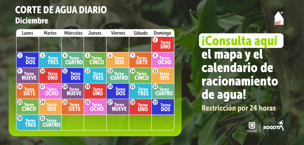 Teniendo en cuenta el calendario de racionamiento, a nuestras dos sedes, Calle 26 y Calle 69, les corresponde el turno número 1 que comprende barrios de las localidades de Antonio Nariño, Barrios Unidos, Chapinero, Los Mártires, Puente Aranda, Rafael Uribe Uribe, Santa Fe, Teusaquillo, Tunjuelito y Usaquén.