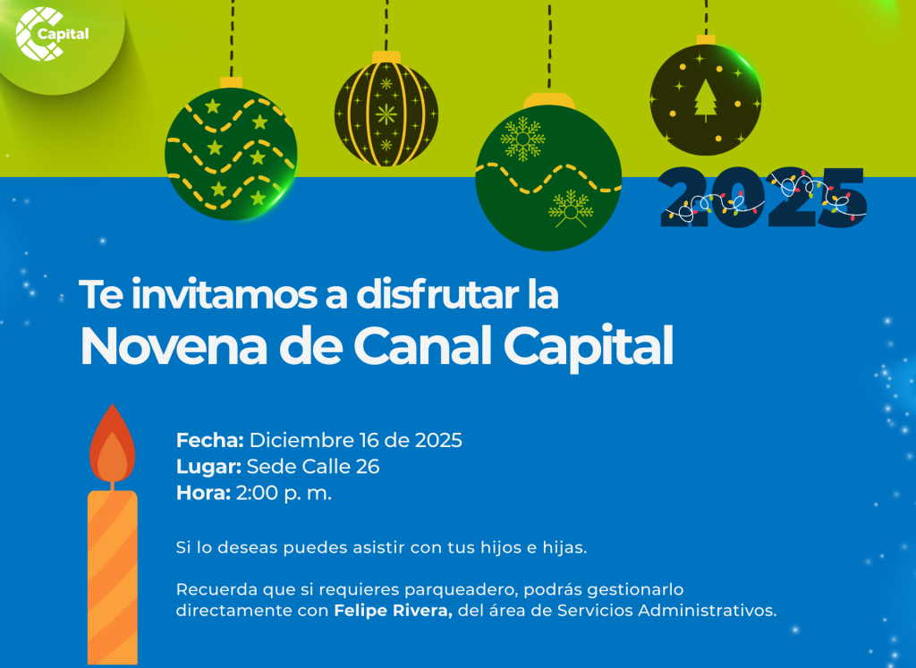 Este lunes 16 de diciembre, a partir de las 2:00 p. m., te esperamos en nuestra sede de la Calle 26 para compartir la Novena Canal Capital 2025. Será un espacio para cantar villancicos, compartir reflexiones, fortalecer nuestros lazos y celebrar juntos la llegada de una de las temporadas más significativas del año.